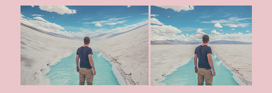 | Korekcja zniekształceń efektu rybiego oka Funkcja „korekcja zniekształceń“ umożliwia kamerze wykonywanie szerokokątnych ujęć zakrzywienia przestrzennego na płaskim tle (tzw. efekt rybiego oka). Dzięki temu nie musisz przeprowadzać żadnej dodatkowej software'owej postprodukcji. |