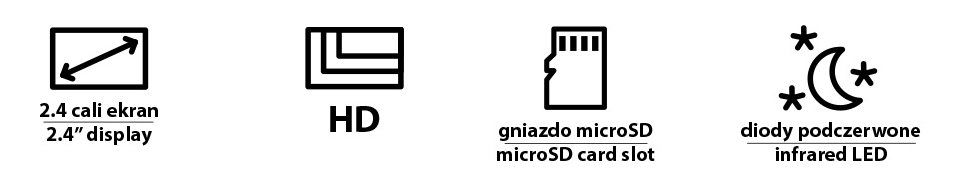 | Rejestrator zapisuje filmy na popularnych i tanich kartach pamięci MicroSD. W zależności od ustawień, może rejestrować wideo ciągłe albo w interwałach czasowych. W tym drugim ustawieniu starsze nagrania są nadpisywane przez nowsze. Dodatkowo użytkownik może naciskając odpowiedni przycisk na obudowie wykonać pojedyncze zdjęcie. Podgląd zapisanych filmów odbywa się na 2,4-calowym ekranie LCD lub po podłączeniu do komputera. | ![]() |