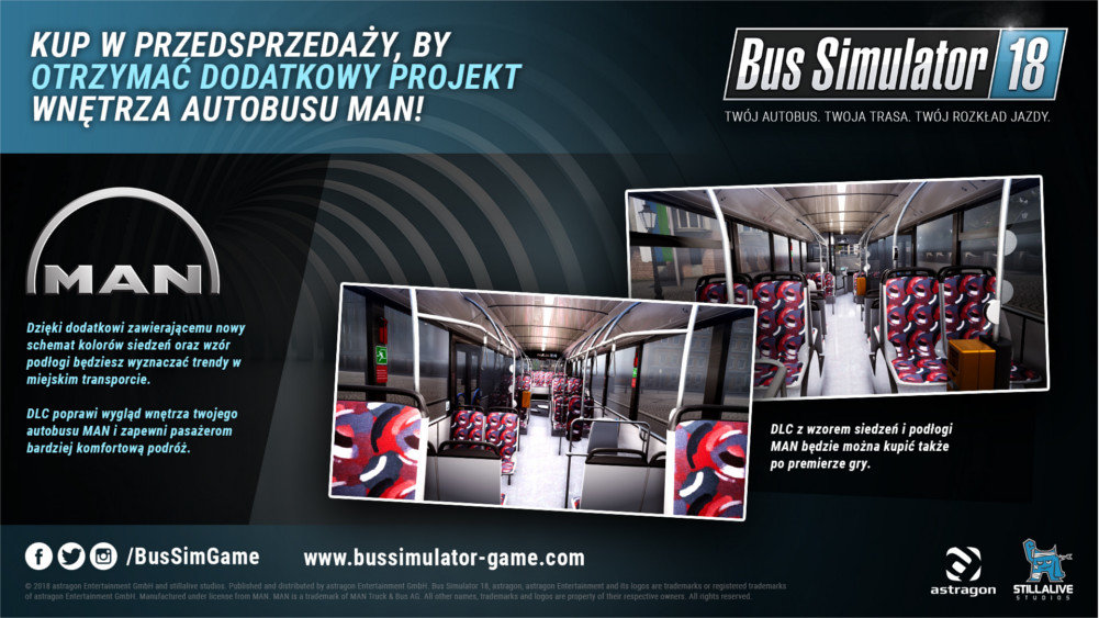 Bus Simulator 18 jest kolejną odsłoną rozwijanej od lat przez Astragon Entertainment serii symulatorów autobusów miejskich. W grze Bus Simulator 18 wcielisz się w przemierzającego rozległą miejską dżunglę kierowcę autobusu. Usiądź za kierownicą jednego z 8 licencjonowanych pojazdów od znanych producentów: Mercedes-Benz, Setra, MAN i IVECO. Przewieź pasażerów do celu bezpiecznie i na czas, grając samemu lub w trybie wieloosobowym. |