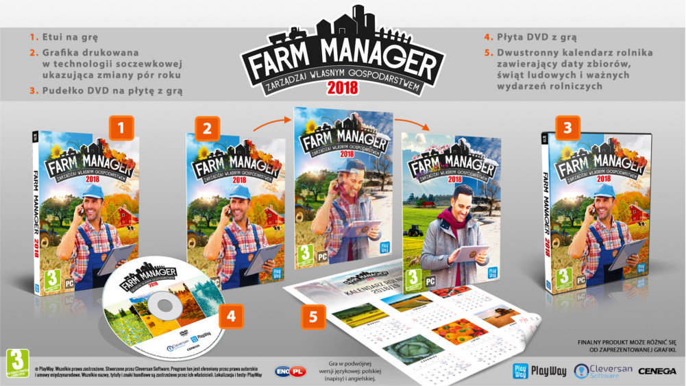 Cechy charakterystyczne gry: - Uprawiaj truskawki, pszenicę, grykę i wiele innych - Zatrudniaj pracowników i podnoś ich kwalifikacje - Hoduj zwierzęta i dbaj o ich zdrowie - Kupuj nowe i używane maszyny - Buduj fabryki i inwestuj w przetwórnie - Stwórz własny mod do gry i podziel się z innymi graczami |