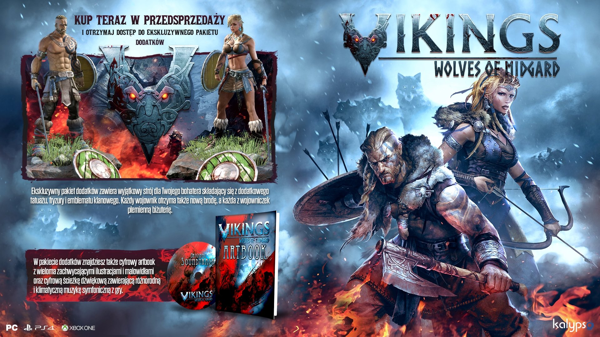 | Zakup grę Vikings – Wolves of Midgard już teraz i zapewnij sobie dostęp do ekskluzywnego pakietu zawierającego dodatkowy strój zarówno dla wojownika, jak i wojowniczki, który składa się z dodatkowego tatuażu, fryzury i emblematu klanowego, a także nowej brody dla wojowników wikingów oraz plemiennej biżuterii dla wojowniczek. Oprócz tego znajdziesz w nim cyfrowy artbook z wieloma zachwycającymi ilustracjami i malowidłami oraz cyfrową ścieżkę dźwiękową zawierającą różnorodną i klimatyczną muzykę symfoniczną z gry. |