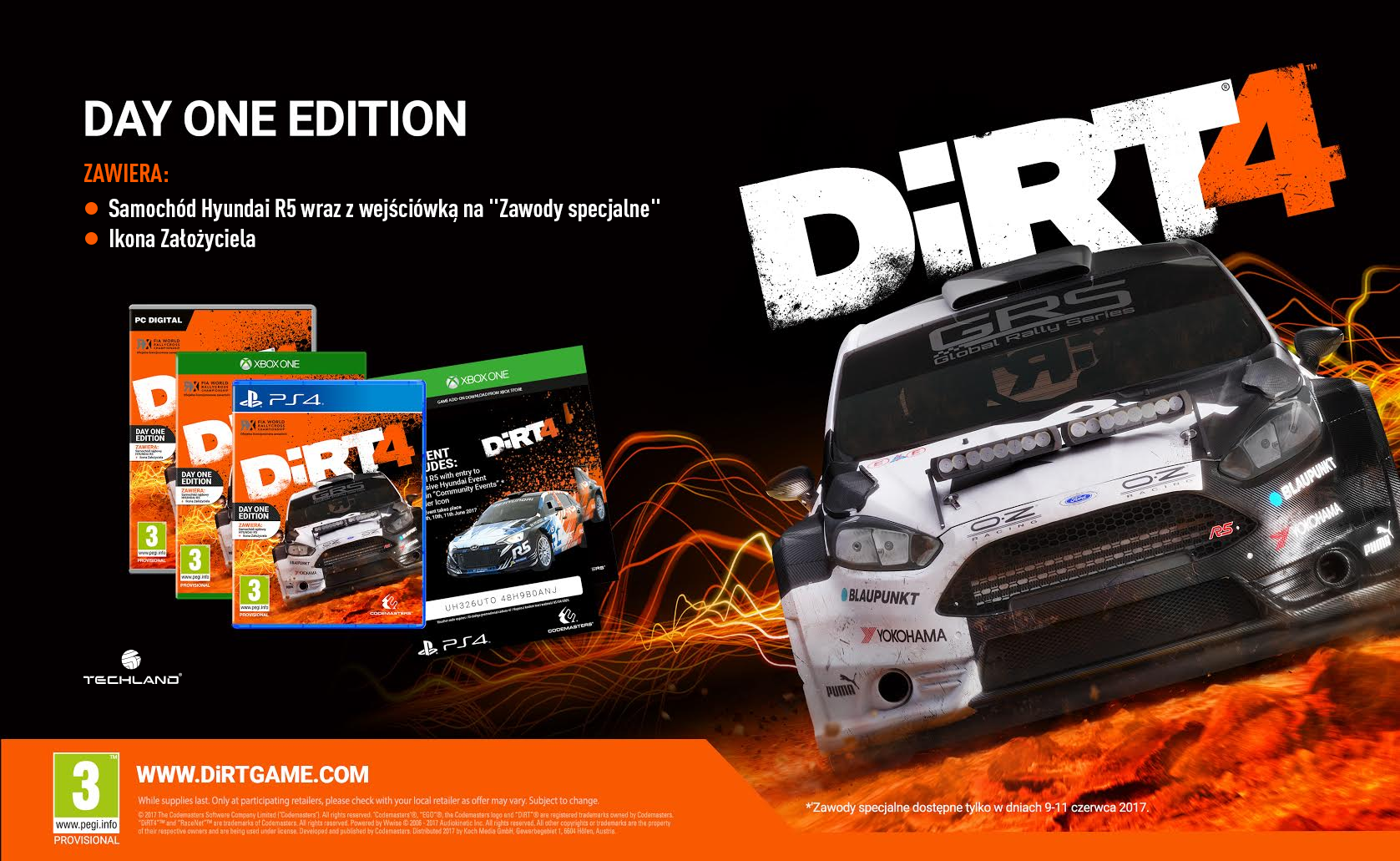 | DiRT 4 to nie tylko nawiązanie jakościowe do sukcesu DiRT Rally, ale też przeniesienie pasji i realizmu rajdów samochodowych na wyższy poziom. Łączy emocje i realizm DiRT Rally z radością, przystępnością i adrenaliną poprzednich odsłon - DiRT 2 oraz DiRT 3. Deweloper nie zapomniał o kontynuacji tradycji kultowej serii Colin McRae Rally, a za sprawą odległych miejsc takich jak Australia, Hiszpania i Kalifornia, gracze poczują, że rajdy to sport o zasięgu globalnym. Ponadto gracz weźmie udział w zawodach rallycross, opartych o licencję FIA World Rallycross Championship, oraz szalonych wyścigach ciężarówek i buggy - Landrush. | |