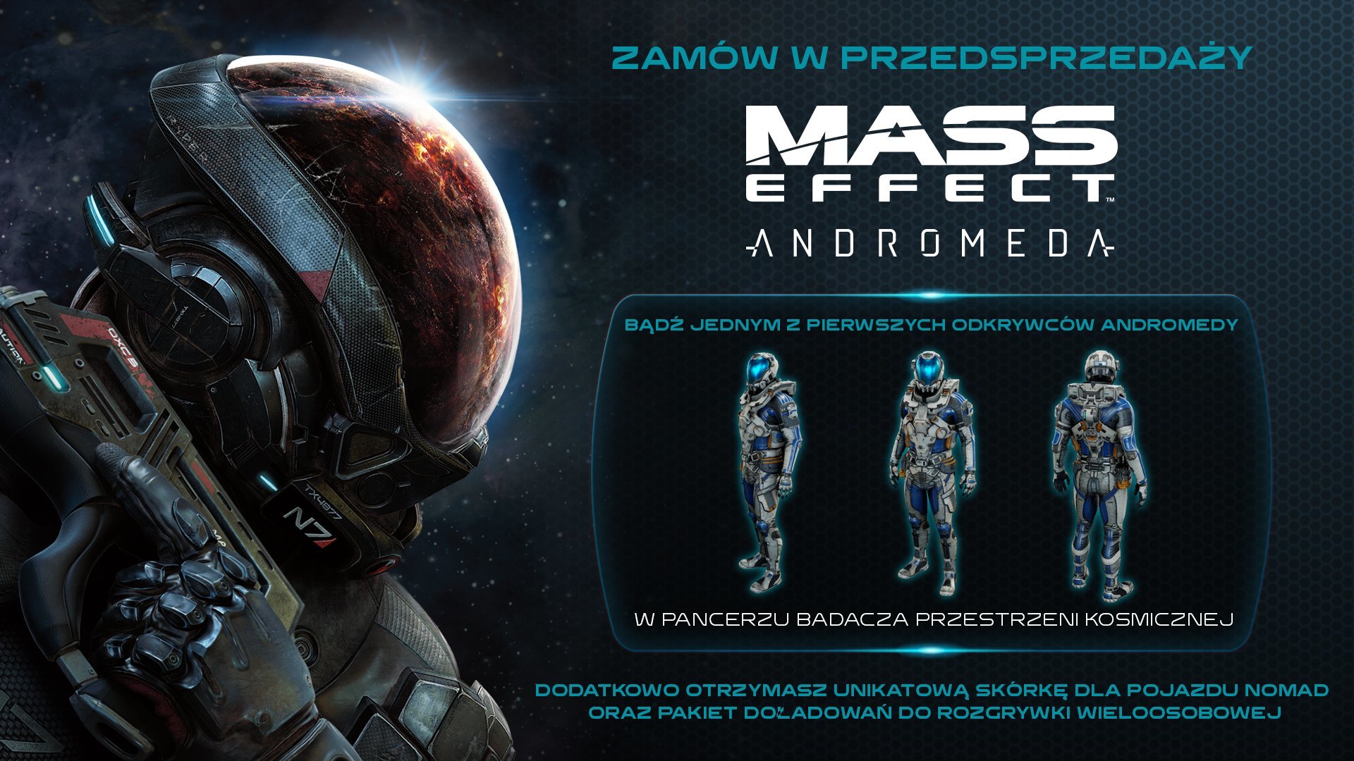 | Złóż zamówienie przedpremierowe, aby otrzymać: Pancerz Badacza Przestrzeni Kosmicznej Załóż wyjątkowy pancerz i przygotuj się na wyzwania krańców Andromedy. Skórka dla Nomada Wyjątkowa skórka dla pojazdu eksploracyjnego Nomad. Pakiet Doładowań Wieloosobowych Dzięki pakietowi doładowań przyspieszysz swój start w rozgrywkach kooperacyjnych. Zawiera 5 szt. 50% doładowań PD (otrzymywane natychmiastowo, limit 1 szt. na rozgrywkę) |