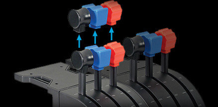 Profesjonalny panel przepustnicy Konfigurowalne końcówki z możliwością odłączenia Każdy system Flight Yoke System obejmuje lotniczy panel przepustnicy. Aby umożliwić precyzyjne sterowanie samolotami wielosilnikowymi, dostępne są dodatkowe panele przepustnicy. Wszystkie dźwignie są w pełni programowalne i odłączalne, dzięki czemu można skonfigurować dowolną kombinacji przepustnicy, wysuwania klap, regulacji mieszanki lub skoku śmigła. Po prostu rozmieść końcówki dźwigni w konfiguracji, która sprawdzi się najlepiej, i przypisz polecenia z ulubionego symulatora. Zapadki dźwigni — fizyczne oznaczenia wskazujące miejsce aktywacji określonych działań — ułatwiają sterowanie przepustnicami trybu jałowego i ciągu wstecznego samolotu. |