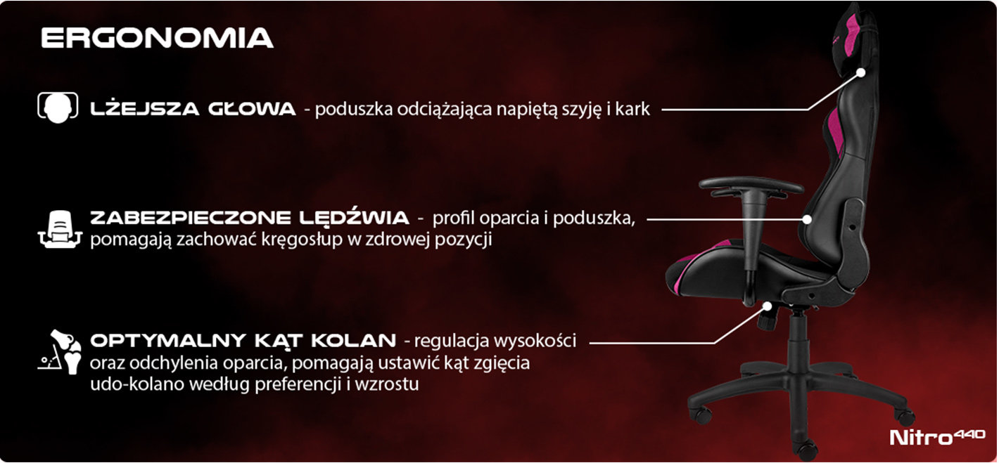 DOPASOWANY DO TWOICH POTRZEBSpędzając dużo czasu przed komputerem często zaczynamy odczuwać ból pleców i ogólny dyskomfort. Nasza efektywność, koncentracja i motywacja znacząco spadają. Z Nitro 440 unikniesz tych problemów! Dzięki zastosowaniu szeregu udogodnień, takich jak możliwość regulacji wysokości siedziska, a także kąta nachylenia oparcia, fotel ustawić możemy zgodnie z preferencjami i odpowiednio do wzrostu, zapewniając swobodę ruchów i odpowiednie ułożenie pleców i nóg, a tym samym utrzymanie prawidłowej postawy. Wygodne podłokietniki gwarantują prawidłowy kąt ułożenia rąk. Dodatkowo funkcja bujania zapewni nam relaks i odprężenie w czasie przerwy podczas wielogodzinnej gry. | |