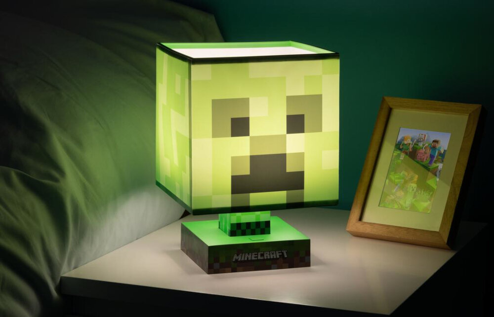 Lampa z zielonym kloszem przedstawiającym jednego z najsłynniejszych stworów z Minecrafta – Creepera. Idealna do postawienia na szafce nocnej, z zaprogramowanymi trzema trybami jasności światła. Klosz wiernie oddaje pikselową estetykę gry. Lampka ma wysokość 27 cm i może być zasilana bateryjnie lub przez USB. Będzie to świetny prezent dla każdego fana Minecrafta lub gracza w wieku powyżej 6 lat.