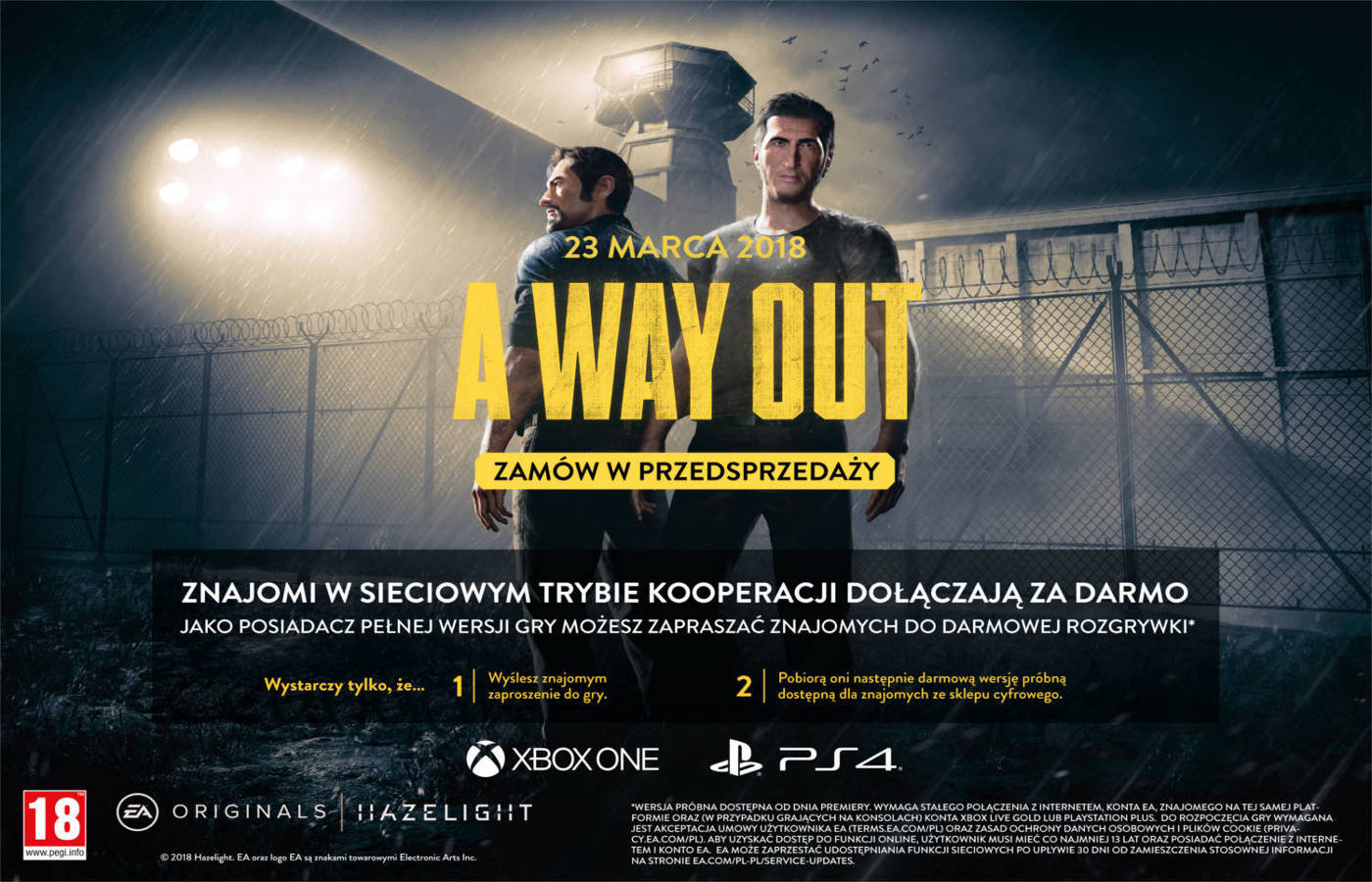 A Way Out to gra kooperacyjna (na kanapie lub przez sieć), w której gracz wciela się w rolę jednego z dwójki więźniów planujących śmiałą ucieczkę z zakładu o podwyższonym rygorze. Ekscytująca operacja szybko zamienia się w emocjonującą przygodę, jakiej świat gier jeszcze nie widział. A Way Out to gra dla dwóch graczy. Każdy z nich steruje jednym z głównych bohaterów. Muszą oni ze sobą współpracować, by uciec z więzienia i poznać swe dalsze losy. Gra porusza temat zaufania i zdrady – gracze będą musieli zmierzyć się z konsekwencjami podjętych przez siebie decyzji. |