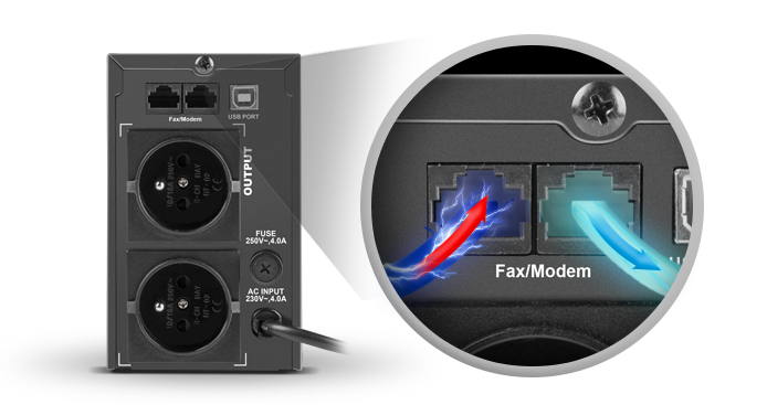 BEZPIECZNY INTERNET I TELEFON - OCHRONA PRZECIWPRZEPIĘCIOWA RJ-11 / RJ-45Aby poszerzyć jeszcze bardziej zakres urządzeń, które na wypadek przepięcia będą bezpieczne, UPS Armac ma z tyłu zamontowane 2 porty RJ-11 / RJ-45 dedykowane dla linii telefonicznej oraz okablowania teleinformatycznego. Jeśli na sieci wystąpią jakiekolwiek przepięcia lub skoki napięcia, UPS natychmiast je wykryje i skoryguje, aby do urządzeń telefonicznych i sieciowych zawsze przesyłany był bezpieczny sygnał. | |