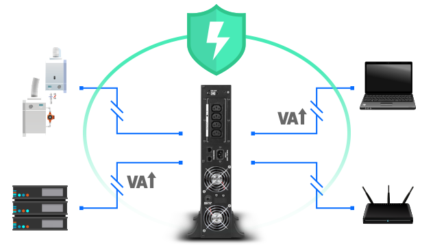 Dzięki zaimplementowaniu w R/1000I/PSW funkcji Automatic Voltage Regulator, klasyczne rozwiązania stosowane w UPS topologii Line-Interactive zostają usprawnione. Dzieje się tak na wskutek wdrożenia autotransformatora sieciowego, który na bieżąco reguluje napięcie przekazywane urządzeniom podpiętym do UPS-a. AVR zapewnia więc komfort i wysoką wydajność.