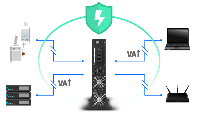 Dzięki zaimplementowaniu w R/2000I/PSW funkcji Automatic Voltage Regulator, klasyczne rozwiązania stosowane w UPS topologii Line-Interactive zostają usprawnione. Dzieje się tak na wskutek wdrożenia autotransformatora sieciowego, który na bieżąco reguluje napięcie przekazywane urządzeniom podpiętym do UPS-a. AVR zapewnia więc komfort i wysoką wydajność.