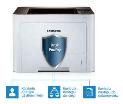 Wysoki poziom bezpieczeństwa dokumentów W każdej firmie opracowuje się i drukuje wiele oficjalnych dokumentów, w tym również dokumenty zawierające informacje poufne, co wymaga stosowania odpowiednich zabezpieczeń podczas drukowania. Urządzenia z serii ProXpress M4020 l 3820 l 3320 zapewniają większą kontrolę użytkowników, dostępu do dokumentów i sieci poprzez współpracę z oprogramowaniem Samsung SyncThru™ Admin w zakresie zabezpieczeń przedsiębiorstwa. |