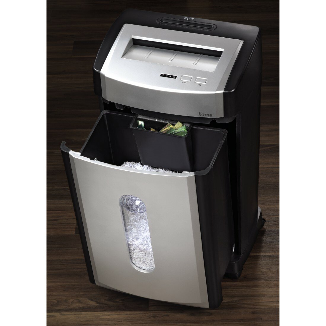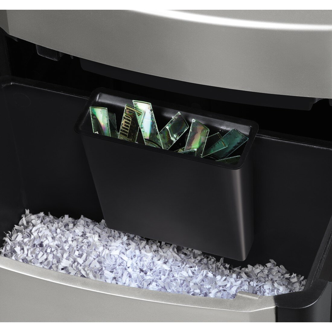 NISZCZARKA HAMA PROFESIONAL M12CD niszczy nie tylko papier, ale także plastikowe karty oraz płyty CD, DVD czy Blu-ray. Do ich niszczenia służy oddzielny podajnik. Płyty i karty można niszczyć także w podajniku na papier. Wówczas zostają rozdrobnione na mniejsze części. Również pojemniki na odpady do papieru oraz do płyt i kart są oddzielne.