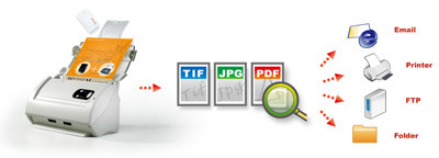 | Skanuj bezpośrednio do popularnego formatu plików za pomocą jednego naciśnięcia przycisku Plustek DocAction czyni skanowanie prostym jak naciśniecie dosłownie jednego przycisku.Dzięki skanerowi Plustek SmartOffice PS283 , możesz skanować bezpośrednio do przeszukiwalnego pliku PDF oraz innych popularnych formatów obrazów, a następnie przesłać zeskanowane przez Ciebie dokumenty na pocztę e-mail, drukarkę, dowolny folder lub serwer FTP. Wszystko co musisz zrobić to jedynie nacisnąć jeden przycisk, który znajduje się na skanerze. Ponadto do skanera PS283 , dołączony jest pakiet sterowników TWAIN, które umożliwiają użycie tysiąca aplikacji do zarządzania dokumentacją oraz zeskanowanymi obrazami. |