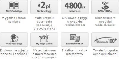 Głowica drukująca typu FINE z kroplami atramentu o wielkości zaledwie 2 pl i rozdzielczość maksymalna 4800 dpi zapewniają wysoką jakość bardzo szczegółowych wydruków. Hybrydowy system atramentów z technologią ChromaLife100+ zapewnia trwałość dynamicznych kolorów i wyraźnego tekstu.