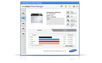 Łatwe monitorowanie pracy drukarki i zarządzanie nią Oprogramowanie Samsung Easy Printer Manager pozwala łatwo kontrolować ustawienia drukarki i stan urządzenia, zamawiać materiały eksploatacyjne i wysyłać faksy – wszystko to za pośrednictwem jednego interfejsu. Możesz wygodnie przeglądać raporty dotyczące błędów i sprawdzać stan drukarki oraz materiałów eksploatacyjnych, a także zdalnie zmieniać ustawienia. Jeden interfejs łączy w sobie wszystkie ustawienia drukarki i związane z nią aplikacje. |