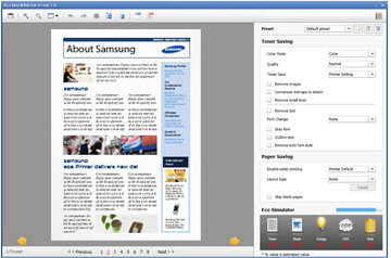 | Niższe zużycie energii i materiałów eksploatacyjnych Sterownik Easy Eco umożliwia zaoszczędzenie nawet do 20% tonera i papieru, a także zmniejszenie zużycia energii. Korzystając z niego, możesz wyeliminować elementy, które zużywają dużo tonera, takie jak obrazy czy pogrubiona czcionka, lub rozjaśnić tekst, tak aby zużyć mniej tonera podczas drukowania. Rozwiązanie to posiada również funkcję podglądu i edycji dokumentów przed drukowaniem, dzięki czemu możesz upewnić się, że efekt końcowy spełni twoje wymagania zarówno pod kątem wydajności, jak i jakości. Funkcja Eco Simulator pokazuje szacunkowy procentowy spadek emisji CO2, zużycia energii elektrycznej i papieru, tak aby każdy mógł sam zobaczyć różnicę. |