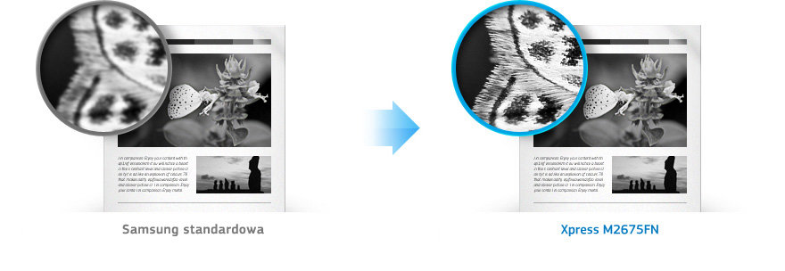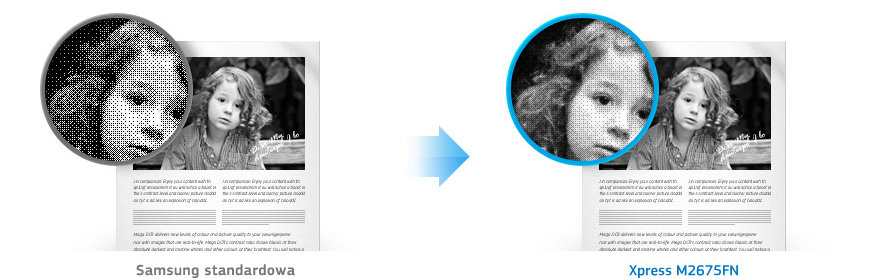 Xpress M2675FN może usunąć desenie półtonów widoczne na zdjęciach, tak aby obrazy na drukowanych kopiach były jasne i gładkie. Dzięki temu poligraficzny efekt końcowy jest wysokiej jakości, odpowiedniej dla biznesu.