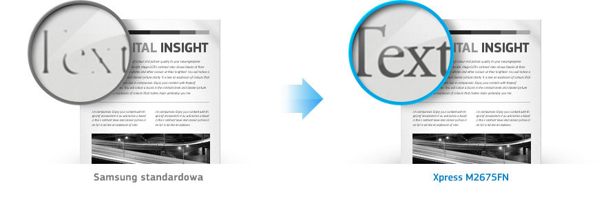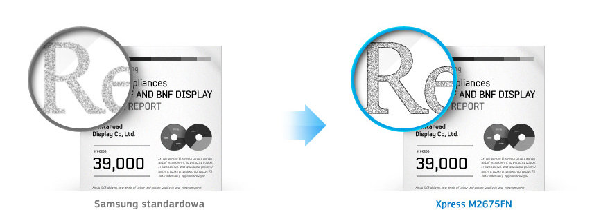 Wiele drukarek ma problem z odczytem wąskich linii lub tekstu napisanego drobną czcionką podczas skanowania lub kopiowania. W drukarce Xpress M2675FN dostępna jest technologia De-ICE, która umożliwia zwiększenie ilości rejestrowanego tekstu, co przekłada się na wyższej jakości wydruki i skany.