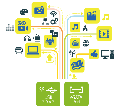 Wyższa wydajność pracy dzięki złączu eSATA i wielu portom USB 3.0 Dzięki zastosowaniu złącza eSATA i trzech portów SuperSpeed USB 3.0, model TS-231 pozwala elastycznie organizować zadania na różnych urządzeniach zewnętrznych bez zakłócania zadań wykonywanych na bieżąco. Użytkownik może wykonywać kopie zapasowe plików na napędy USB i eSATA, ma dostęp do danych przechowywanych na kartach SD za pośrednictwem czytników kart USB, może udostępniać przez sieć do 3 drukarek i może się połączyć z zasilaczem UPS w celu zapewnienia ciągłości zasilania. |