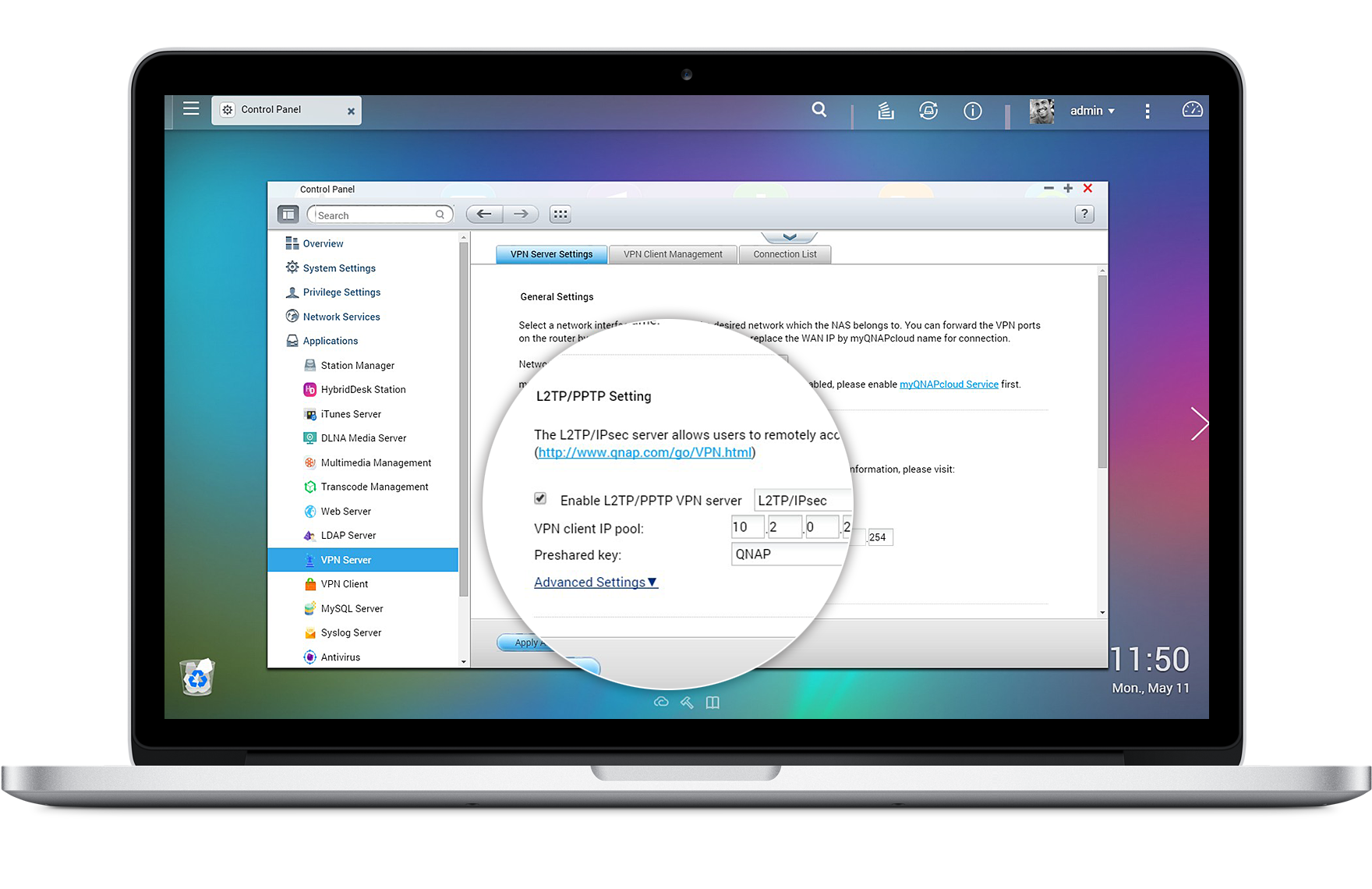 Bezpieczny dostęp dzięki serwerowi i klientowi VPN TS-251+ może działać jako serwer VPN z obsługą standardów L2TP/IPsec, OpenVPN i PPTP oferując bezpieczny dostęp do danych w sieci lokalnej. Serwer TS-251+ udostępnia także klienta VPN z obsługą standardów PPTP i OpenVPN, który chroni poufność przesyłanych danych. |