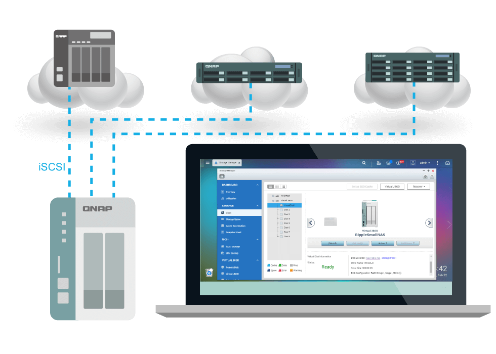 TS-251A obsługuje sieci SAN iSCSI. Po utworzeniu obiektu docelowego iSCSI w modelu TS-251A można uzyskiwać dostęp do iSCSI przy użyciu komputera i adresu IP serwera NAS.