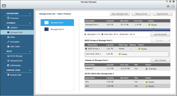 | Wydajny i elastyczny wolumen QNAP Elastyczny wolumen QNAP zapewnia bezpieczniejszy i elastyczniejszy sposób przechowywania danych w urządzeniach typu NAS. Jest to wolumen nowej generacji, który oferuje wydajne funkcje takie jak pooling pamięci z wolumenami typu thin provisioned, odzyskiwanie przestrzeni oraz blokowe jednostki logiczne iSCSI LUN. |