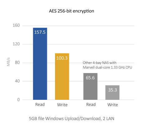 Wyposażony w mocny, a mimo to energooszczędny dwurdzeniowy procesor ARM Cortex-A15 1,4 GHz oraz 1 GB pamięci RAM DDR3, model TS-431+ jest wysokowydajnym urządzeniem NAS dedykowanym dla grup roboczych i małych i domowych biur. Urządzenie oferuje doskonałe parametry: prędkość odczytu do 193 MB/s i prędkość zapisu do 157 MB/s. Oferowany przez TS-431+ mechanizm przyspieszanego sprzętowo szyfrowania i deszyfrowania zapewnia prędkość transferu powyżej 157 MB/s; rozwiązanie pozwala też na szyfrowanie całego wolumenu NAS 256-bitowym szyfrem AES, co razem podnosi wydajność i jednocześnie zapewnia bezpieczeństwo poufnych danych prywatnych przechowywanych na TS-431+. Użytkownik może też używać modelu TS-431+ jako centrum multimediów: zasoby multimedialne można oglądać w czasie wykonywania zadań pobierania lub backupu plików i nie wpływa to na wydajność TS-431+. W przypadku instalacji najnowszej karty sieciowej 802.11ac lub dwupasmowej karty Wi-Fi USB 2,4 GHz / 5 GHz 802.11n, model TS-431+ jest w stanie oferować niezwykle wysokie prędkości przesyłania dużych plików oraz strumieniowania multimediów wymagających dużej szerokości pasma.
