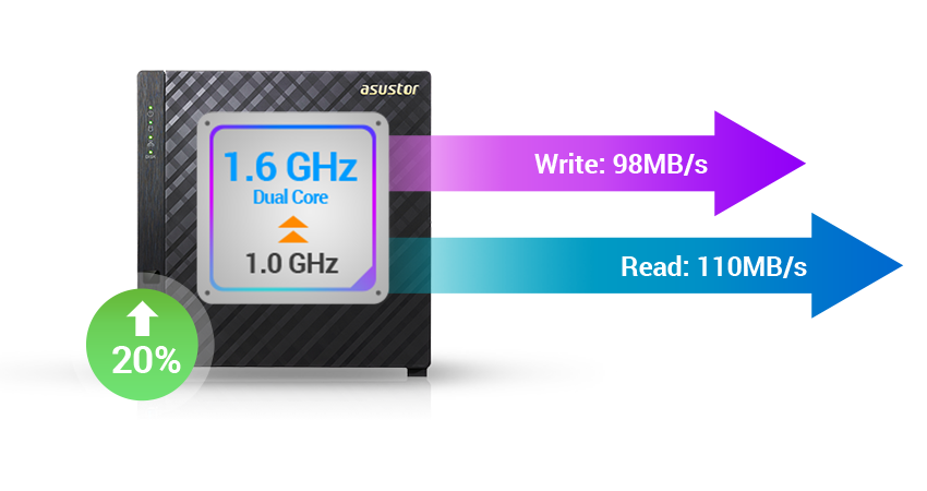 Odświeżona seria urządzeń AS10 v2 posiada nowy, mocniejszy dwurdzeniowy procesor Marvell ARMADA-385 o taktowaniu 1,6GHz – znacznie wydajniejszy od swojego poprzednika! Dzięki tej optymalizacji sprzętowej jak i samego oprogramowanie możliwe jest uzyskanie prędkości zapisu równej 98MB/s a prędkość odczytu wzrosła do 110MB/s. Suma summarum nowa wersja urządzeń AS10 v 2 jest to o 20% bardziej wydajna niż produkty poprzedniej generacji. Ponadto ASUSTOR poprawił szybkość działania systemu zarówno systemu operacyjnego ADM jak i jego aplikacji co umożliwia np. płynniejsze przeglądanie albumów zdjęć lub przesyłanie / pobieranie plików, dzięki czemu praca na tym urządzeniu jest wydajniejsza oraz przyjemniejsza.