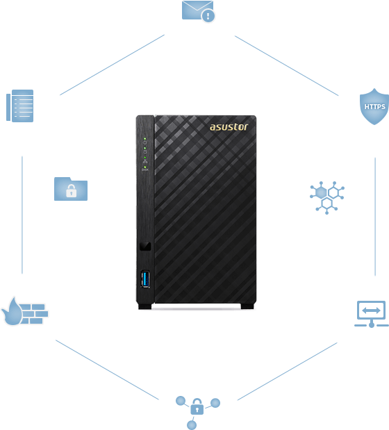 Serwer AS1002T v2 umożliwia Tobie włożenie dwóch dysków (HDD lub SSD) działających np. w konfiguracji RAID 1, co w efekcie pozwala na jednoczesne, bezpieczne przechowywanie danych oraz wykonywanie kopii zapasowych. Oczywiście użytkownik ma do wyboru więcej konfiguracji RAID (pula zależy od ilości zamontowanych dysków) a bogactwo opcji bezpiecznych połączeń zapewniają brak stresu podczas korzystania z Internetu.