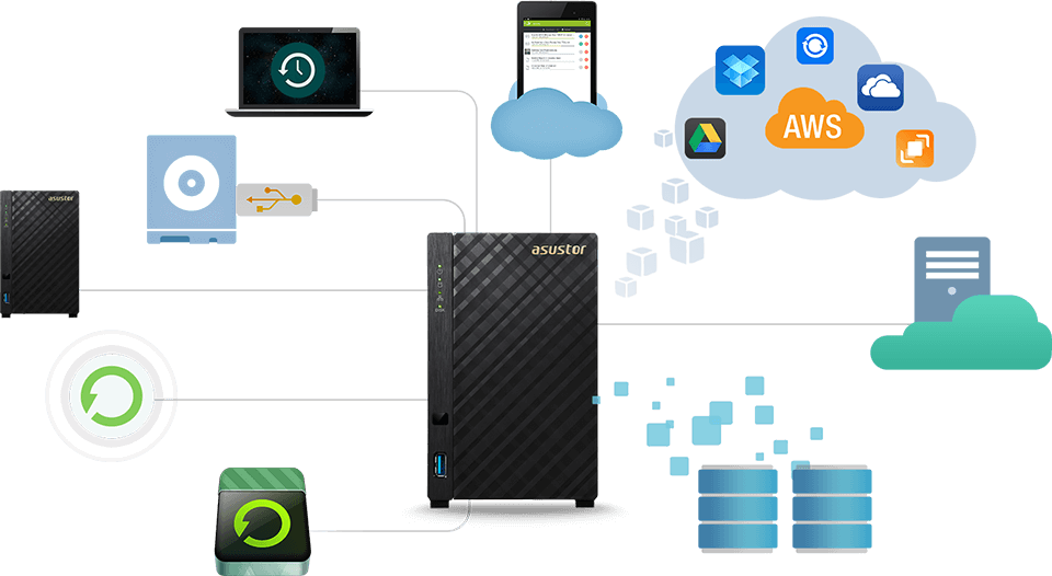 Odświeżona seria serwerów NAS ASUSTOR AS10 posiada wiele różnych opcji tworzenia kopii zapasowych i aplikacji podłączonych do różnych publicznych usług przechowywania danych w chmurze, w tym Amazon S3, Dropbox, Google Drive, OneDrive, Box.net, HiDrive, Ralus, WonderBox, xCloud oraz CrashPlan. Ponadto użytkownik może skorzystać z eksploratora FTP, zewnętrznych obudów dysków twardych USB, zewnętrznych dysków twardych oraz lokalnych kopii zapasowych, aby zapewnić prawidłowe i w pełni kompletne tworzenie kopii zapasowych danych.