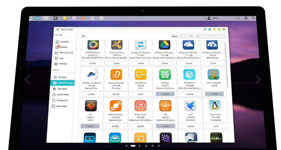 Uwolnij olbrzymi potencjał drzemiący wewnątrz darmowego sklepu ”Centrum aplikacji” zainstalowanego domyślnie na serwerach ASUSTOR. Dzięki temu niesamowicie przydatnemu programowi, możesz przeglądać i pobierać wybrane aplikacje, które wzbudzą Twoje zainteresowanie. Absolutnie nie ma znaczenia fakt, czy interesujesz się biznesem, tworzeniem stron internetowych, czy masz ochotę na cyfrową rozrywką multimedialną – wszystko to i wiele więcej znajdziesz w ”Centrum aplikacji” ASUSTOR Dostępnych jest ponad 200 unikalnych aplikacji, które łącznie zapewnia wielką różnorodność programów, które są niezbędne do zaspokojenia wszelkich Twoich potrzeb. Już teraz poznaj nieograniczony potencjał urządzeń ASUSTOR NAS podczas tworzenia swojego własnego, spersonalizowanego urządzenia NAS