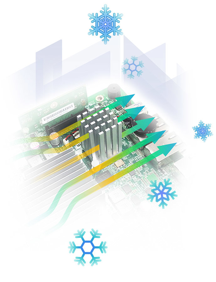 Wysokowydajne chłodzenieSeria urządzeń Lockerstor wykorzystuje wentylatory PWM z inteligentnymi regulatorami prędkości oraz mocowanie z bolcem, aby osiągnąć optymalny przepływ powietrza, zwiększyć stabilność serwera i utrzymać wysoką wydajność chłodzenia nawet przy najwyższych obciążeniach. Ulepszona konstrukcja serwerów Lockerstor posiada również lepsze wentylatory, które są wyższe niż w poprzednich seriach, co przekłada się na jeszcze wydajniejsze chłodzenie i odprowadzanie ciepła. | |