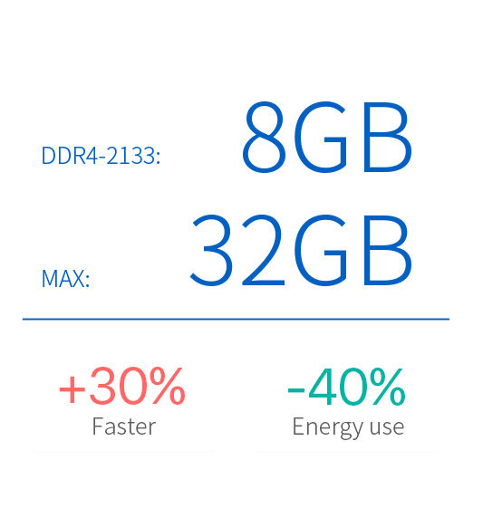 Modele Lockerstor wyposażone są w 8GB pamięci RAM DDR4, którą bez przeszkód możemy zwiększyć do 32GB GB. Generacja DDR4 pamięci RAM oferuje 30% skok wydajności 30% w porównaniu z poprzednią generacją, przy 40% mniejszym zapotrzebowaniu na energię.