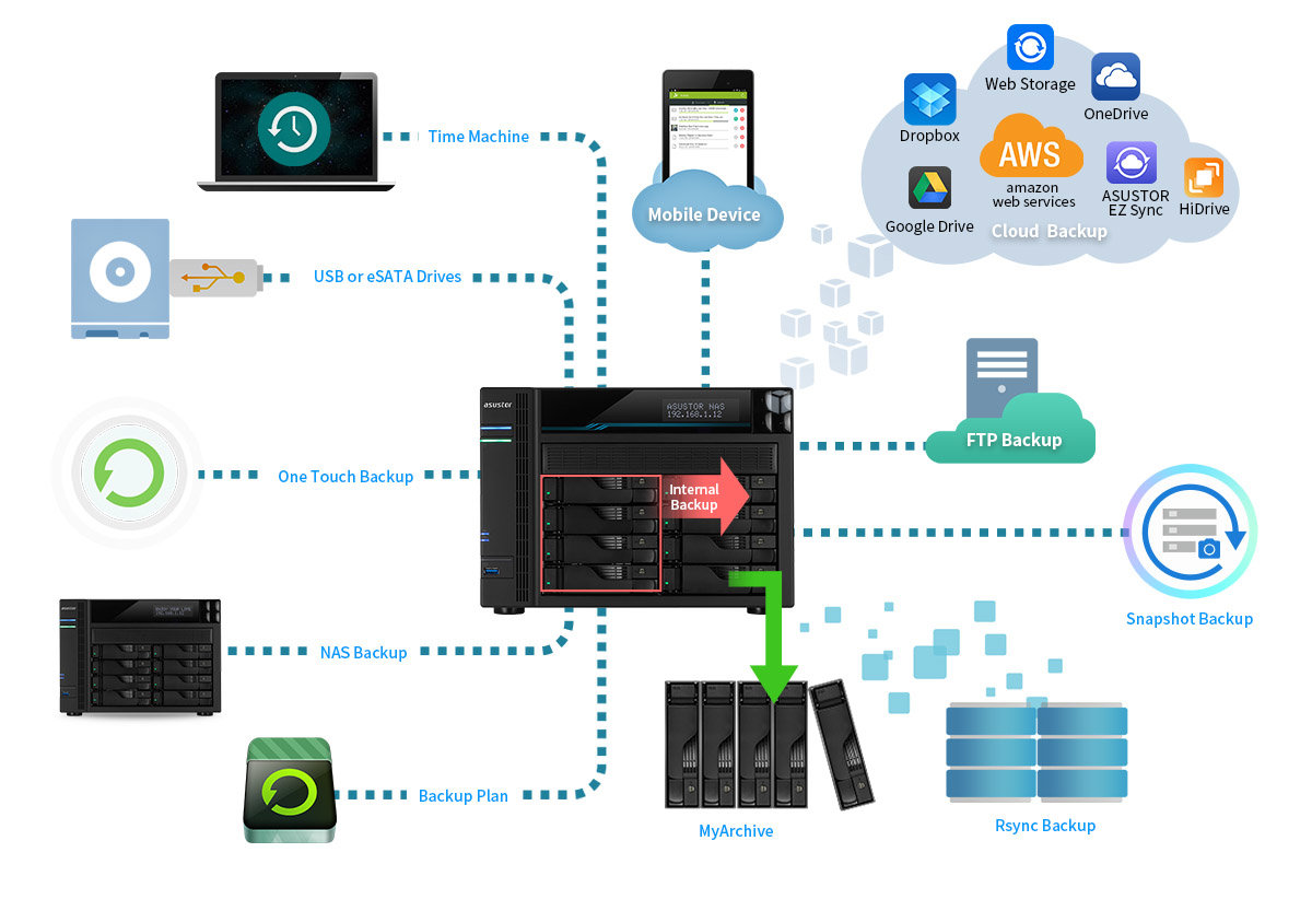 ASUSTOR daje użytkownikom kompletny plan do” backupu” danych - 12 różnych opcji tworzenia kopii zapasowych i aplikacji podłączonych do różnych publicznych usług przechowywania danych w chmurze, w tym Amazon S3, Dropbox, Google Drive, OneDrive, Box.net, HiDrive, Ralus, WonderBox, xCloud oraz CrashPlan. Co więcej obsługiwane przez serwer NAS programy ”Backup Plan” (dla systemu Windows) oraz ”Time Machine” (dla systemu macOS) gwarantują proste i szybkie tworzenie kopii zapasowych na komputerach stacjonarnych i laptopach, a wymienne dyski twarde zarchiwizowane w MyArchive zapewniają długoterminowe i bezpieczne przechowywanie plików. Jeśli chodzi o nowości, serwery NAS ASUSTOR obsługują teraz system plików linuxowych ”Btrfs”. Zupełnie nowa aplikacja “Snapshot Center” umożliwia użytkownikom wykonywanie migawek (snapshotów) swoich informacji, na wypadek przypadkowego usunięcia czy nieplanowanej modyfikacji. Dzięki tej aplikacji łatwo przywrócisz poprzednie wersje plików, zdjęć etc.