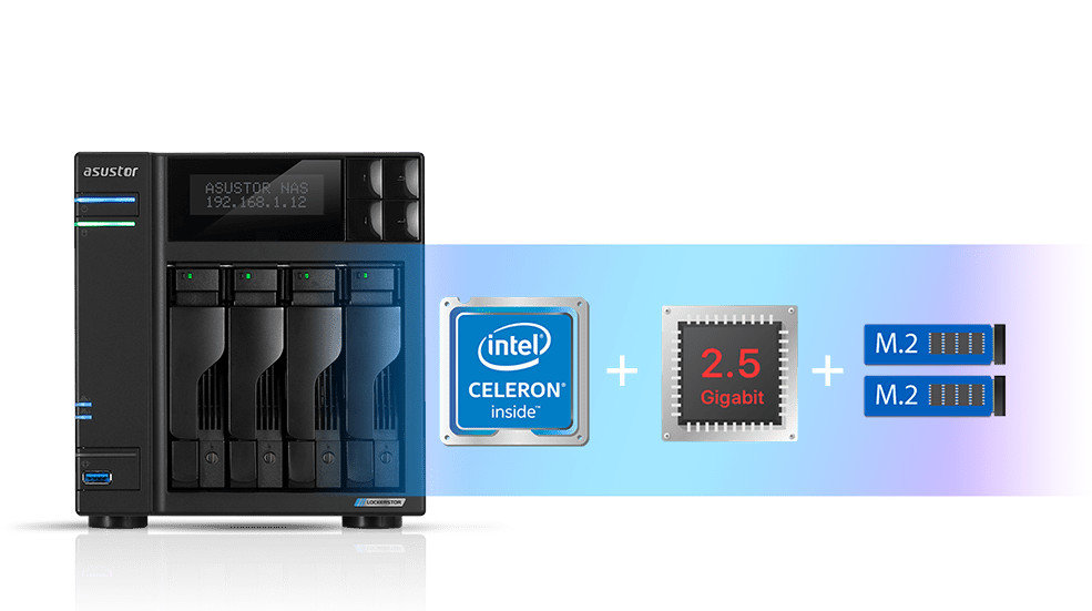 | AS6602T LOCKERSTOR 2- 2 porty RJ-45 Ethernet 2.5G – obsługa prędkości do 5Gbps z agregacją łączy - 2 gniazda SSD M.2 NVMe pod szybkie cache - Niesamowita jakość rozdzielczości 4K - Czterordzeniowy procesor Intel Celeron - o 30% bardziej wydajny niż poprzednik - 4GB pamięci DDR4-2400 - 30% wyższa wydajność od poprzedniej generacji DDR3 - Obsługa Wake on LAN (WoL) oraz Wake on WAN (WoW) |