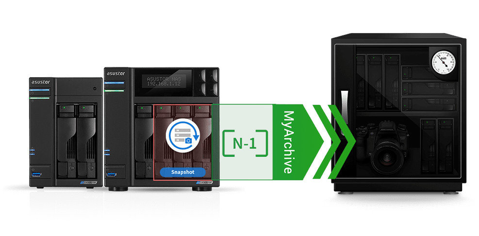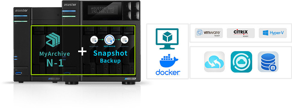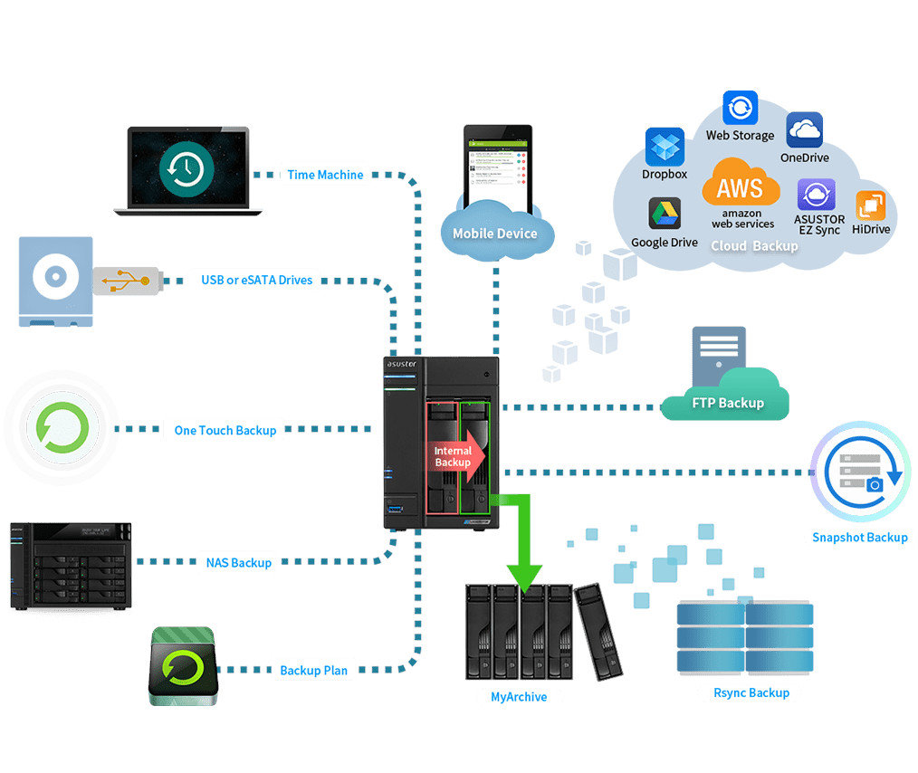 ASUSTOR daje użytkownikom kompletny plan do” backupu” danych - 12 różnych opcji tworzenia kopii zapasowych i aplikacji podłączonych do różnych publicznych usług przechowywania danych w chmurze, w tym Amazon S3, Dropbox, Google Drive, OneDrive, Box.net, HiDrive, Ralus, WonderBox, xCloud oraz CrashPlan. Co więcej obsługiwane przez serwer NAS programy ”Backup Plan” (dla systemu Windows) oraz ”Time Machine” (dla systemu macOS) gwarantują proste i szybkie tworzenie kopii zapasowych na komputerach stacjonarnych i laptopach, a wymienne dyski twarde zarchiwizowane w MyArchive zapewniają długoterminowe i bezpieczne przechowywanie plików.