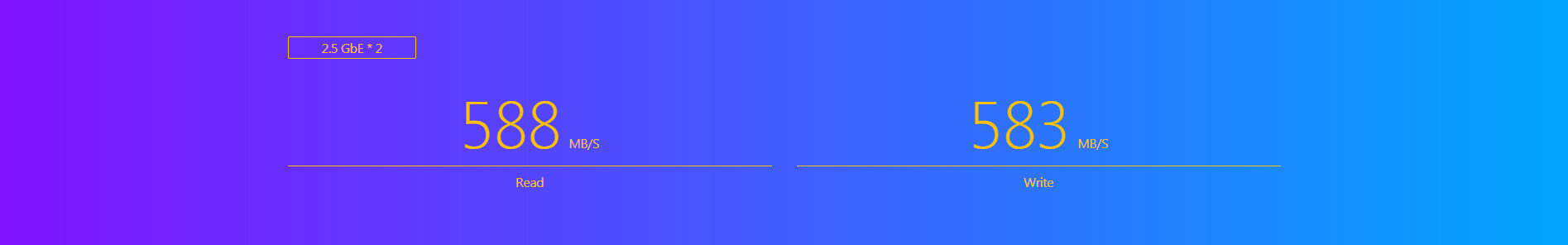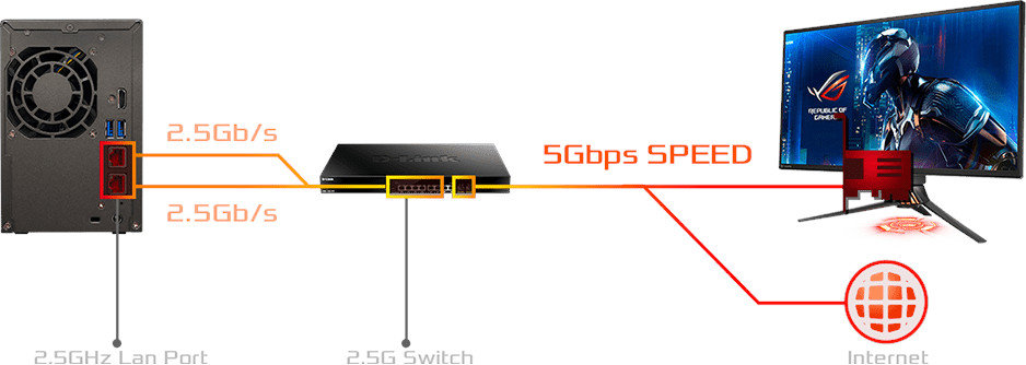 2.5-Gigabit Ethernet. W przypadku maks. dostępnej przepustowości jest to skok wydajności o 150% w przypadku do standardowego rozwiązania sieci Gigabit Ethernet. To nie jest jednak szczyt możliwości tego serwera NAS – włączając funkcję agregacji łączy* użytkownik otrzymuje do dyspozycji maks. przepustowość równą 5Gbps.