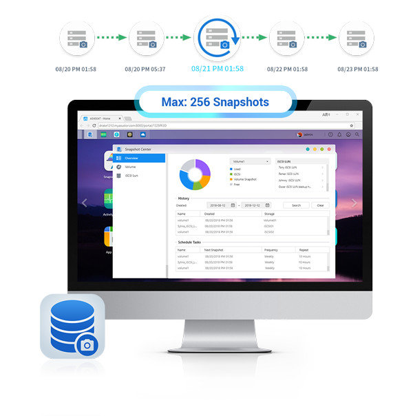 Co więcej serwery NAS ASUSTOR obsługują system plików linuxowych ”Btrfs”. Aplikacja “Snapshot Center” umożliwia użytkownikom wykonywanie migawek (snapshotów) swoich informacji, na wypadek przypadkowego usunięcia czy nieplanowanej modyfikacji. Dzięki tej aplikacji łatwo przywrócisz poprzednie wersje plików, zdjęć etc.