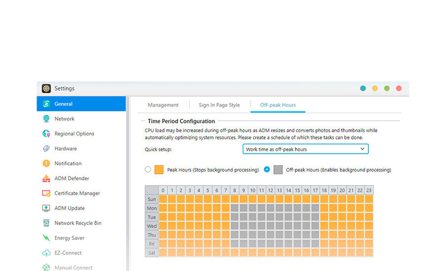 Twój czas jest bardzo cenny, dlatego ADM oferuje funkcję, która gwarantuje, że Twój NAS będzie działał z maksymalną prędkością, kiedy tylko zechcesz. Czasy wzmożonej pracy (Off-peak hours) pozwalają na wyłączenie niektórych procesów w tle i ich konserwacji w określonych porach dnia. Wszystko to można elastycznie konfigurować. Poza tymi zdefiniowanymi godzinami, wyłączone procesy w tle zostaną przywrócone do normalnego działania. Aby zapewnić optymalne rezultaty, należy włączyć tą funkcjonalność, gdy serwer NAS nie jest aktywnie używany, na przykład podczas działania w trybie uśpienia.