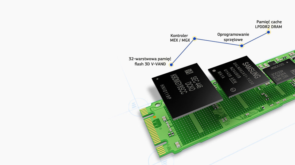Idealnie dopasowane komponenty Firma Samsung jest jednym z nielicznych producentów, który samodzielnie projektuje wszystkie komponenty dysków SSD. Znamy je od podszewki i wyciskamy z nich jak największej już od wczesnych etapów produkcji. Otrzymujesz większą wydajność, pamięć podręczną LPDDR2 DRAM do aż 1 GB i większą energooszczędność dzięki trójrdzeniowemu kontrolerowi MEX. |