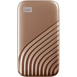 Dysk WD My Passport 500 GB SSD w kolorze złotym, kabel USB-C / USB-C, adapter USB-C / USB-A, oprogramowanie WD Discovery, instrukcja obsługi, karta gwarancyjna.