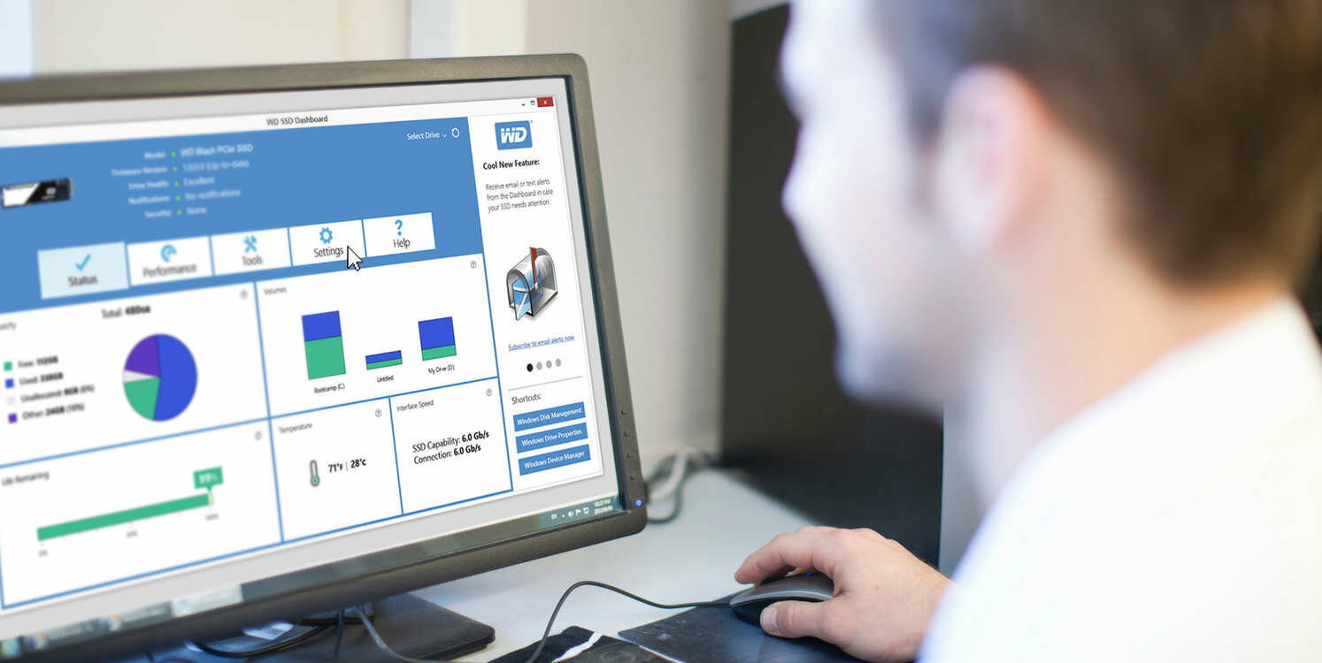 Monitoruj kondycję swojego dysku, korzystając z darmowego interfejsu administracyjnego WD SSD do pobrania, i klonuj dyski za pomocą oprogramowania Acronis® True Image™ WD Edition.