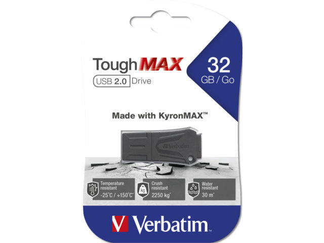 |   OmówienieDysk USB 2.0 ToughMAX firmy Verbatim został wykonany z komponentów KyronMAX™ — stosowanego zamiast metalu tworzywa termoplastycznego, które jest w stanie wytrzymać skrajnie nieprzyjazne warunki i jest wykorzystywane w najbardziej wymagających zastosowaniach: od rowerów górskich po samoloty myśliwskie. Komponenty KyronMAX™ są niezwykle lekkie i wytrzymałe, co sprawia, że idealnie nadają się na obudowy pamięci USB, które zniosą praktycznie wszystko i ochronią dane przed fizycznym zniszczeniem.
