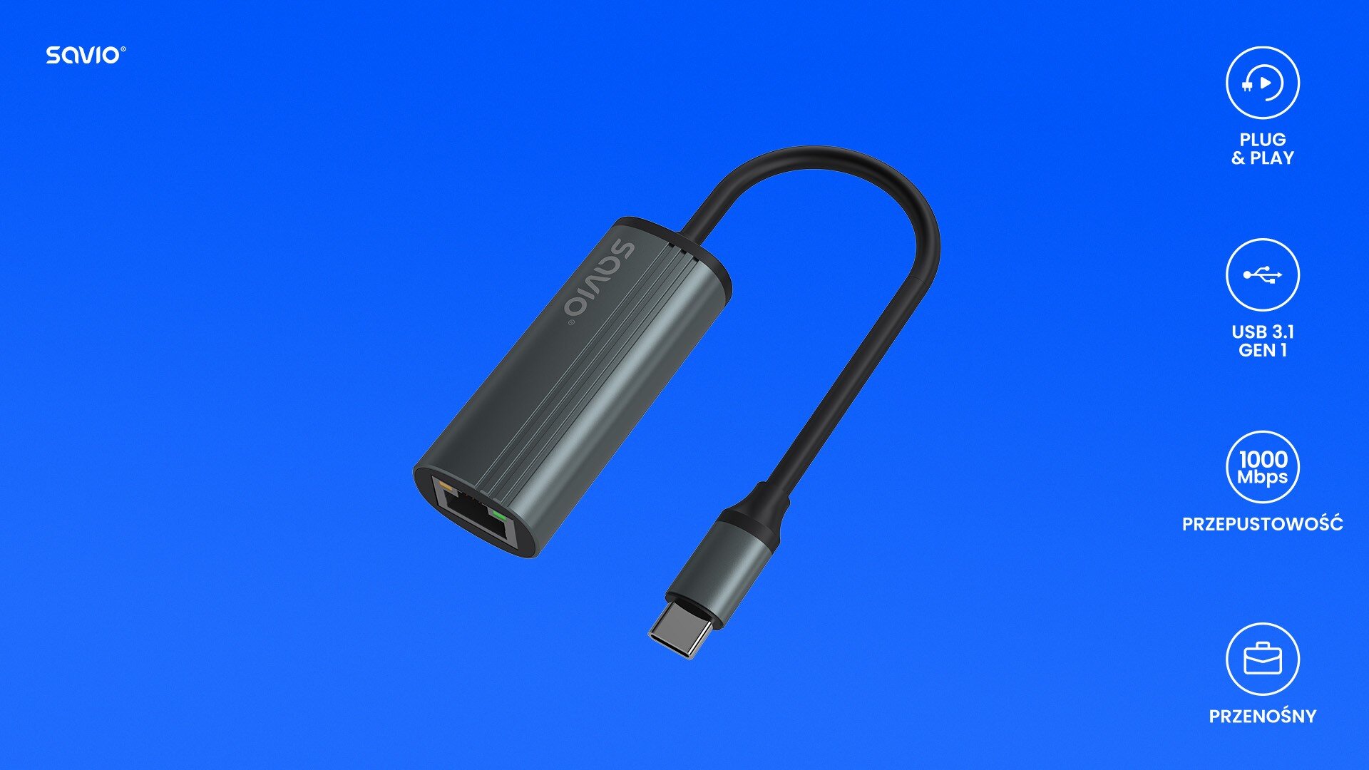 SAVIO AK-56 Adapter USB-C 3.1 Gen 1 do RJ-45 Gigabit Ethernet