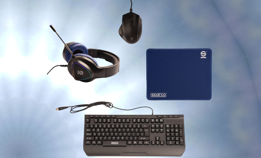 W opakowaniu znajduje się: klawiatura z końcówką USB-A, mysz z końcówką USB-A, słuchawki z końcówką USB-A, podkładka pod mysz SPARCO Kitpro Poleposition 4w1, dokumentacja.