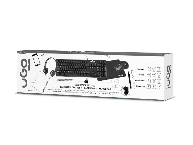 Zestaw 4w1 UGO składa się z wytrzymałej i odpornej na zużycie klawiatury, myszy optycznej USB Plug&Play, które idealnie nadają się do użytku biurowego, dopełnieniem zestawu są słuchawki nauszne z wygodnym mikrofonem na kablu i niezbędna podkładka pod mysz.