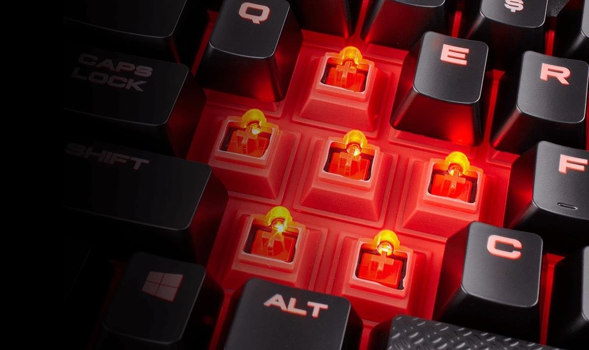 Imponujące czerwone podświetlenie wraz z oprogramowaniem CORSAIR Utility Engine (CUE) umożliwia programowanie zaawansowanych makr i dynamicznych efektów świetlnych.