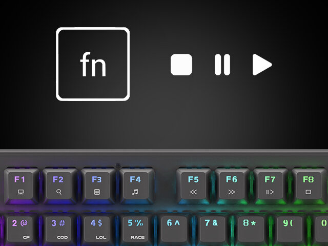 Klawisze MultimedialneDzięki klawiszom multimedialnym, Thor 300 RGB poprawia komfort codziennego funkcjonowania. Dzięki różnym opcjom rozmieszczonym na przyciskach F1 - F12 masz łatwy dostęp do popularnych aplikacji jak kalkulator czy poczta. Wygodnie też kontrolujesz multimediami – sprawnie zmienisz aktualnie odtwarzaną piosenkę i wyregulujesz głośność nawet podczas grania. | |