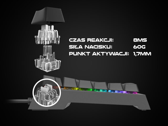 Klawiatura Thor 210 RGB została wyposażona w unikatowe przełączniki hybrydowe, które cechuje szybki czas reakcji wspomagany niskim punktem aktywacji 1,7 mm oraz wyczuwalny i słyszalny próg aktywacji. Graj bez opóźnień!