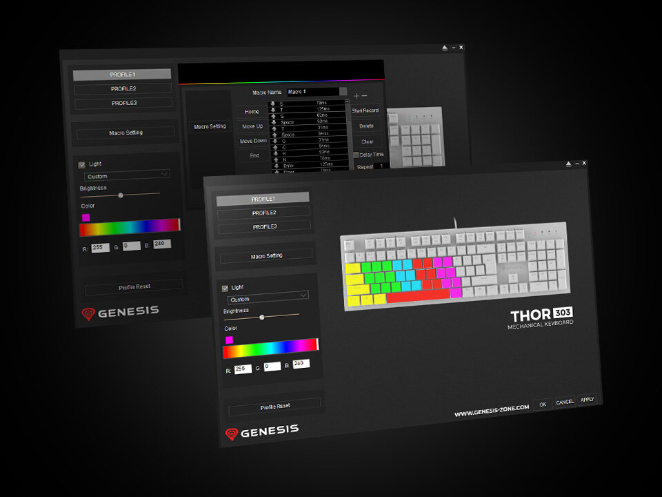 | ZAAWANSOWANE OPROGRAMOWANIEThor 303 obsługuje dedykowane oprogramowanie, pozwalające w pełni spersonalizować ustawienia urządzenia. Wybierz ulubiony tryb podświetlenia RGB, skonstruuj zabójcze combo i skonfiguruj makra oraz profile. Dzięki wbudowanej pamięci urządzenie zapamięta wszystkie Twoje ustawienia co sprawia, że nawet po podłączeniu klawiatury do innego sprzętu nie musisz ponownie jej personalizować. |